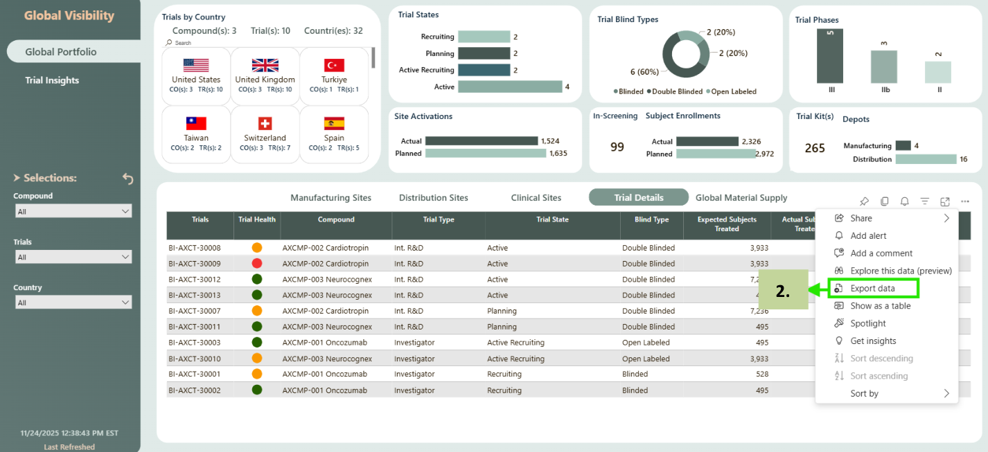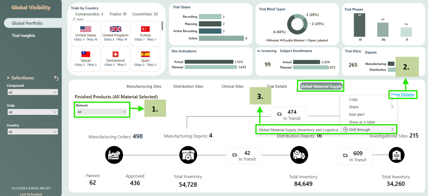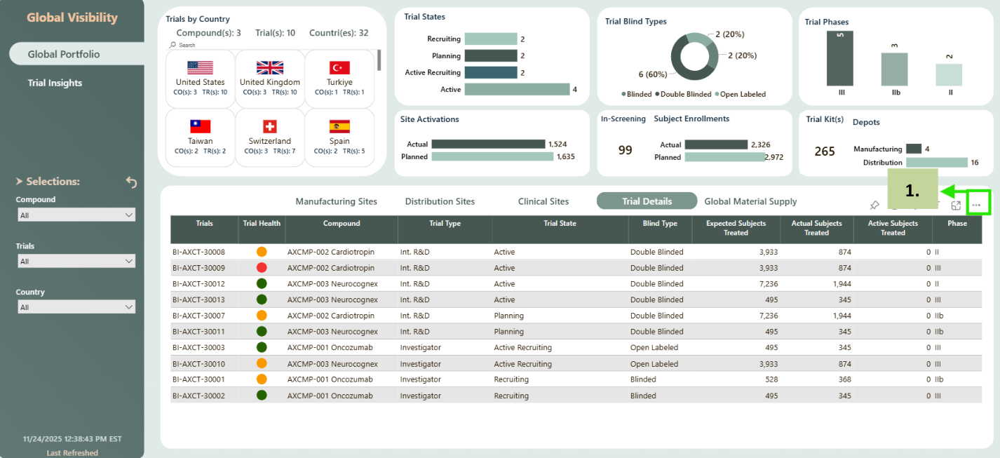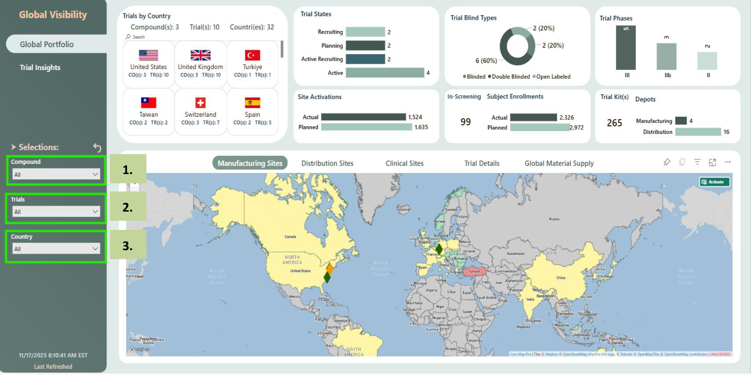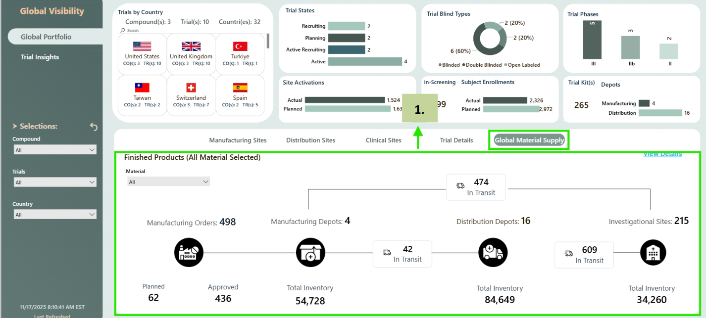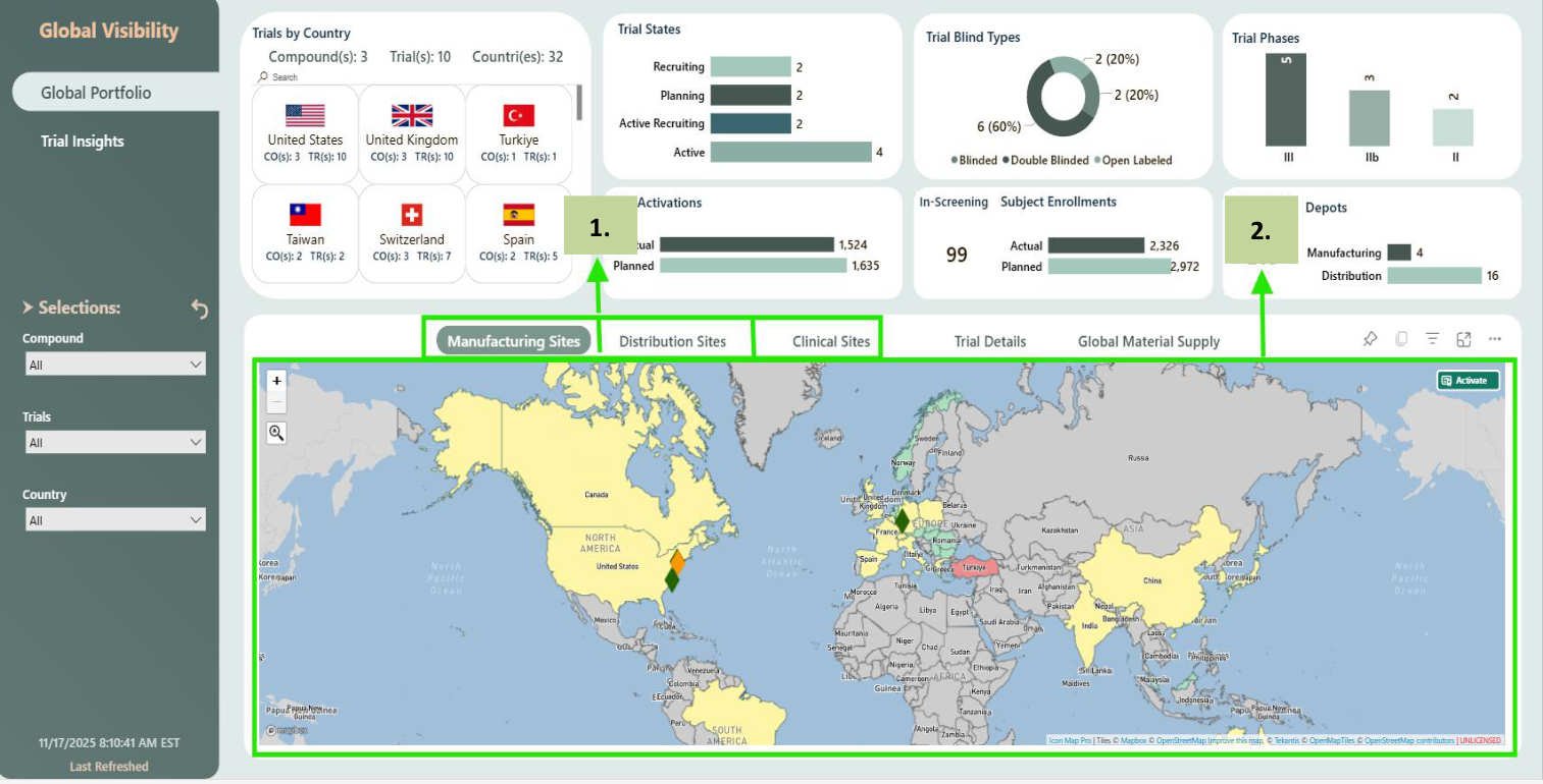 Global Portfolio provides a comprehensive summary of all R&D Assets/ Compounds and Clinical Trials that are in various trial states, trial phases and countries. It provides visibility into all countries, manufacturing sites, distribution depots and clinical sites that are participating in the clinical trials. It also provides details of number of sites, subjects which are planned for enrolment and actual enrolment of sites, subjects.